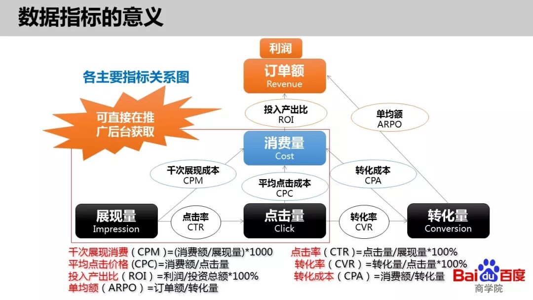 3、销售阶段,关系到我们的转化量,转化这里面涉及到的数据包括转化量,转化率,平均转化成本,订单额,投入产出比。那今天给大家分享的是百度推广指标和销售指标两个方面。